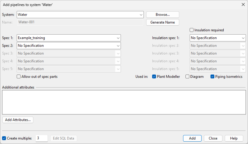 The Add pipelines to system 'Water' dialog opens.