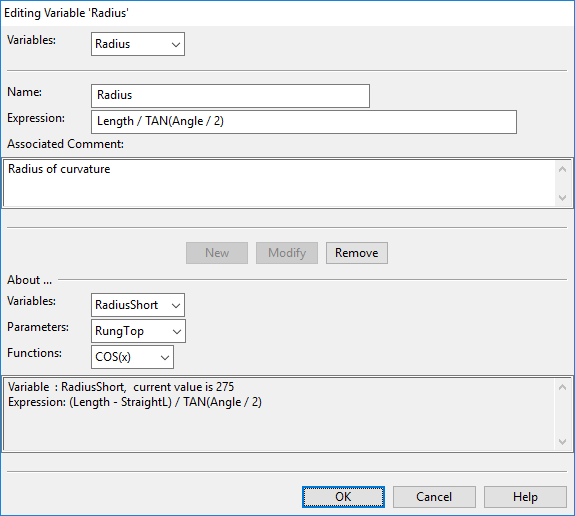 In the lower part of the dialog you can select a variable, parameter, or function to display information about it in the text box at the bottom. You can use this as reference information when defining or modifying a variable.