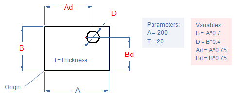 In this example you create two parameters and four variables to define the dimensions for a plate with a hole. The plate curve is sketched (Edit New) from the section origin, but notice that the origin for the template curves is located in the center of the rectangle.