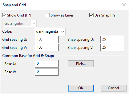 Base U, Base V – Specify the base point to use for grid and snap, in horizontal and vertical direction.