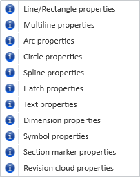 In the Properties menu, the Objects in a set section contains tools for changing the properties of several drafting objects at the same time and for deleting drafting objects that have a certain property value.