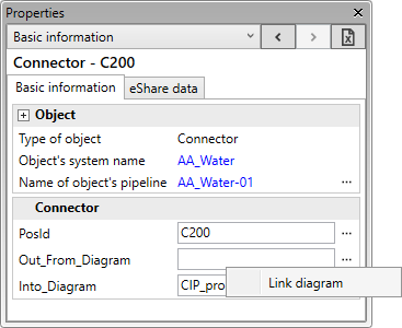 When a connector symbol is selected, the context menu contains the Connected diagram command. Selecting this command opens the diagram where the pipeline continues and highlights the target connector and its label.