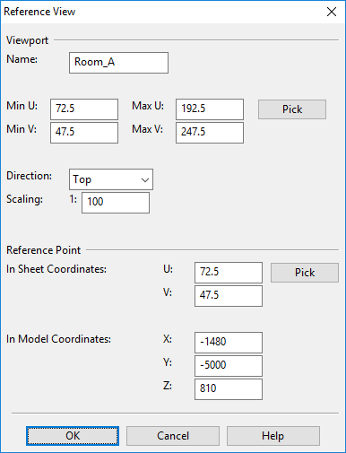 Reference Point – Specify the reference point of the view, first in diagram sheet coordinates (U, V), and then in 3D model coordinates (X, Y, Z). When specifying model coordinates, the Z value is important as it defines the height at which the reference view will be located in the model.