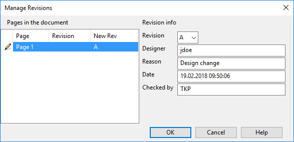 File > Document > Edit Revision Table opens the Manage Revisions dialog where you can specify revision, designer, revision reason, revision date, and additional document revision information that administrator has defined in the project settings to be included, as described in Document Revision and Publishing.