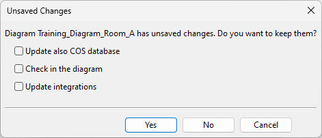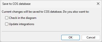 Save to COS database – Saves the diagram in COS. You are prompted whether to also check in the diagram and update the diagram data in integrated applications (Plant Modeller, Electrical).