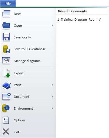 The File menu of P&ID contains general application commands for managing diagrams. Many of these commands can also be found in the Manage diagrams tool. Some of the commands are enabled only when a diagram is checked out and active.