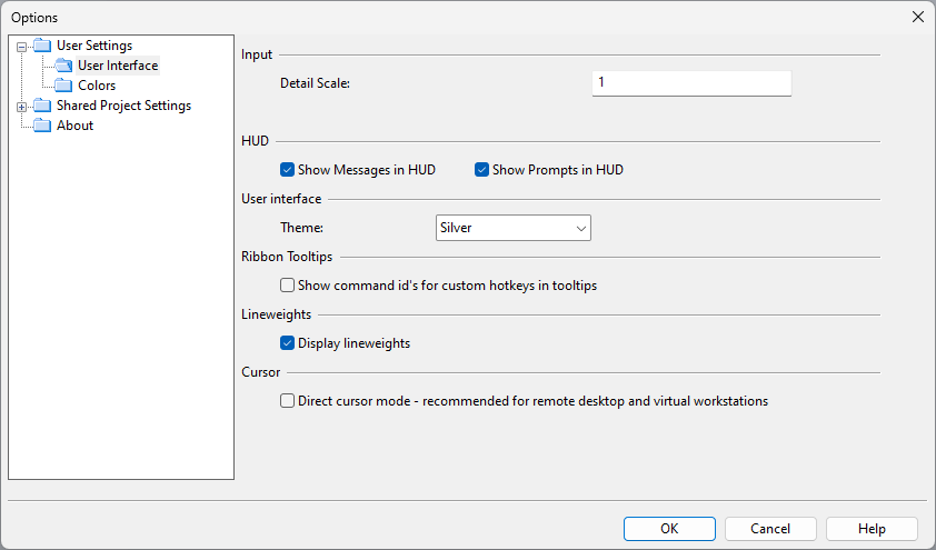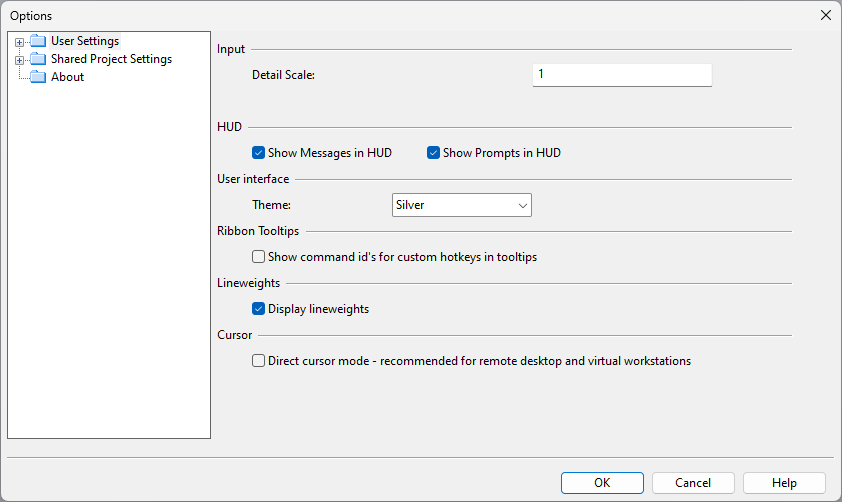 Show prompt in HUD – If selected, information about what the program expects the user to do next is shown next to the cursor and in the status bar. If not selected, the information is only shown in the status bar.