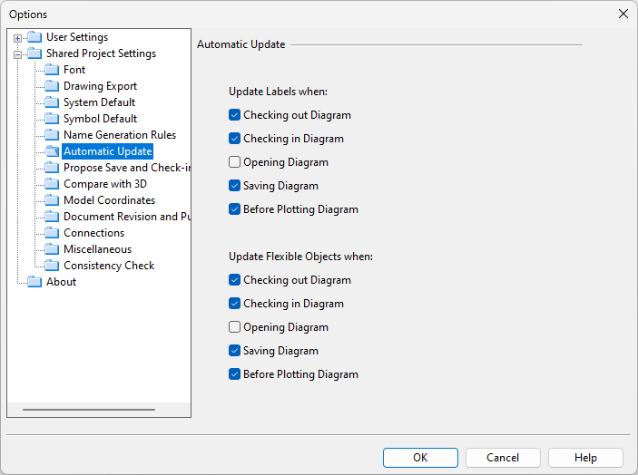 Automatic update can be set to occur when checking out a diagram, checking in a diagram, opening a diagram, saving a diagram, or before plotting a diagram.