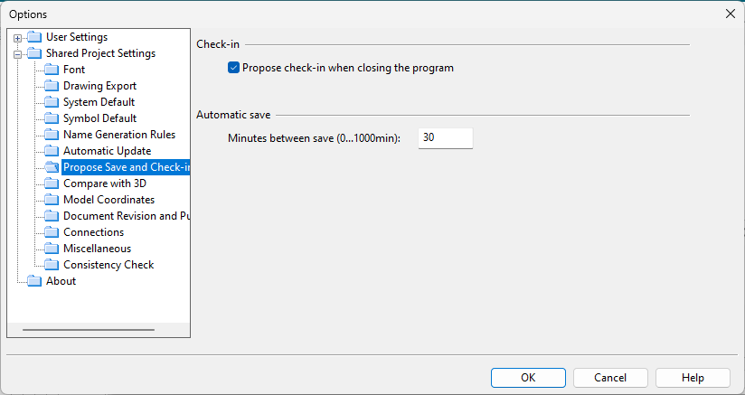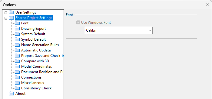 Font | Drawing Export | System Default | Symbol Default | Name Generation Rules | Automatic Update | Propose Save and Check-in | Compare with 3D | Model Coordinates | Document Revision and Publishing | Connections | Miscellaneous | Consistency Check