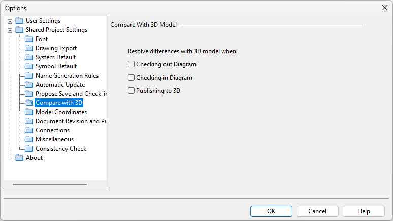 You can select whether the program should automatically run the Compare with 3D model function when a diagram is checked out, checked in, or published to the 3D model. If the diagram objects are published to 3D and there are differences between the diagram data and the 3D model data, a comparison dialog opens for reviewing the differences.