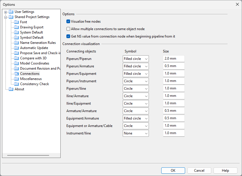 Select how to visualize different types of connections, such as the connection between two pipe runs or the connection between an instrument and an instrument line. For each connection, you can select the symbol to use (none, circle, or filled circle) and the size of the symbol.