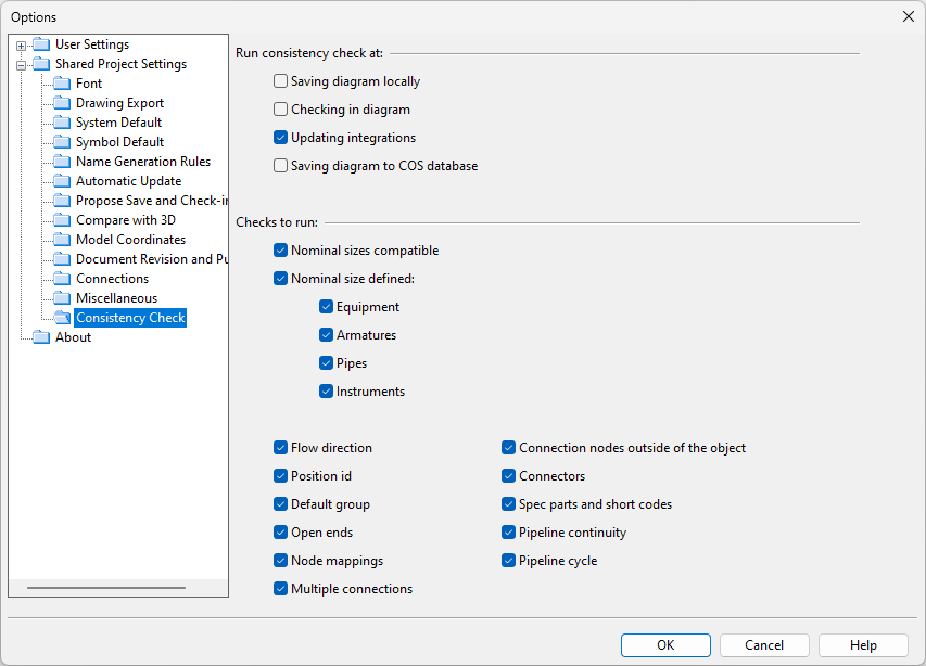 Updating integrations – If selected, consistency checks are run when the user is saving a diagram in COS and selects to update the diagram data in integrated applications (Plant Modeller, Electrical).