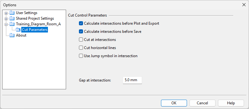 Gap at intersection – Specify the gap size at the intersection. This is applied to both cuts and jump symbols. The default gap size is 2.5 mm.