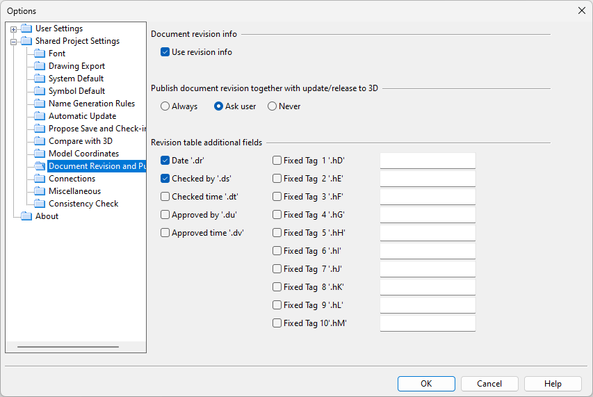 If use of revision information is enabled, select whether updating diagram data to the 3D model also publishes the document revision information: Always, Ask user (default), or Never.