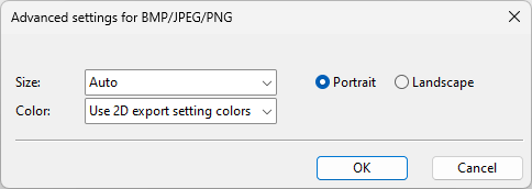 The Advanced button opens a dialog for defining format-specific settings, if available for the selected format. For example, for BMP/JPEG/PNG export you can specify drawing size, page layout as portrait or landscape, and whether to use the 2D export setting colors or just black and white.