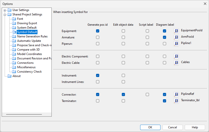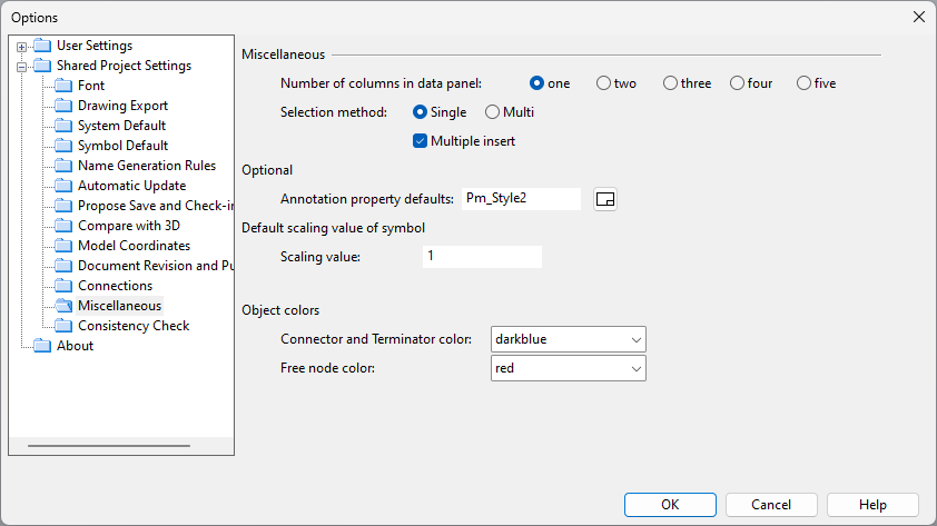 In the Options dialog of P&ID, the Shared Project Settings section allows the project administrator to define settings that affect all project users.