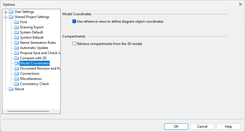 Retrieve compartments from the 3D model – If both the reference views setting and this setting are selected, diagram objects automatically retrieve compartment information from the 3D model.