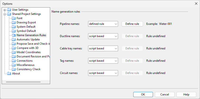Note: P&ID and Plant Modeller use the same line name generation rules. Changing the rules for pipelines, ductlines, or cable trays in one application will affect the generating of line names in both of them.