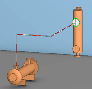 Using integration between Plant Modeller and P&ID allows the 3D design work to be assisted by information that is provided by P&I diagrams. The pipe routing tool shows the route from the current equipment to the target equipment/valve. If more than one pipeline connects to one piece of equipment, the Plant Modeller user must select the correct pipeline from a list of candidates. If the pipeline knows its start point and end point, the routing assistance bar shows the way to the correct equipment's center point.