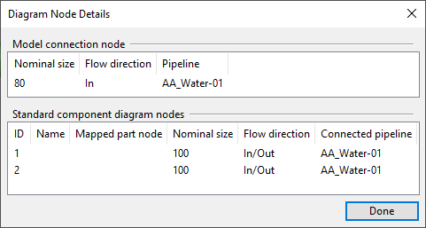 The piping network information can be used in the insertion if the nodes of the diagram object have been manually mapped to those of the Catalog Part that the Standard Component uses (see Mapping nodes between P&I diagram and the 3D model) or if the program can identify the allowed nodes based on nominal size and flow direction.