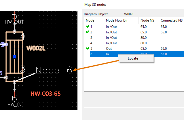 The program compares the target node (connection point) in the 3D model to the nodes of the diagram object. Any diagram nodes that have a wrong nominal size, flow direction or (connected) pipeline are filtered out.