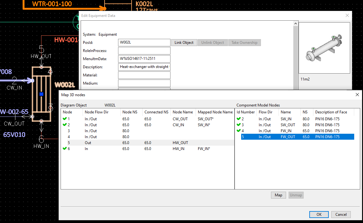 P&ID users can create mappings between P&I diagram nodes and the 3D model. A diagram object can be linked to a component model stored in the library through the DmPartCode field in the Edit Data dialog or the DmPartCode field in the Property pane. The mapping tool reads the node information from the GDL and presents it together with the nodes from the P&ID object.