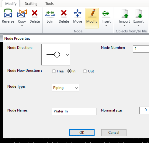 The node name of diagram objects can be defined already in the diagram symbol. Especially for simple cases such as IN/OUT and Suction/Discard, it is recommended to set matching names to the symbols. This can be done in the Node Properties dialog, which you can open with the Modify command.