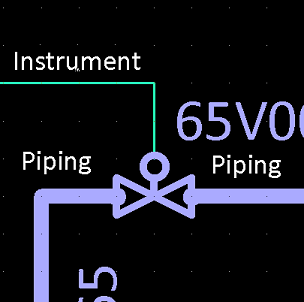 In the picture below, the valve symbol is connected to one instrument line and two pipelines. If the instrument line's node type is set to 'Instrument' and the piping network is released to 3D, only the specified kind of line can be connected to this node in the 3D model. However, if the node type is 'Generic' or 'Piping', the topology check interprets this as a three-way valve, thus allowing a pipe run to connect to the instrument line's node. The program automatically sets the node type when additional connection lines are drawn in diagrams, such as when an 'Iline' is connected to a valve.