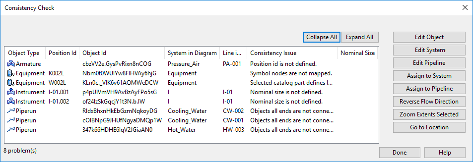 - Go to Location – Hides the Consistency Check dialog and moves the cursor to the location of the selected object. Press Esc to return to the dialog.