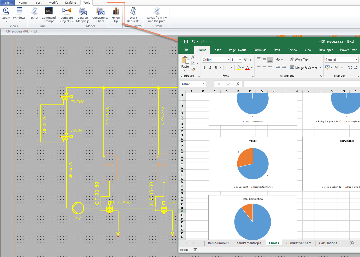 Select Follow Up to create a Microsoft Excel report of how many instances of each object type have been inserted into the active diagram and how many of them exist in the respective 3D model in Plant Modeller. When there are multiple similar projects, the report can give a good overview of how much work is completed for each diagram and how much of the routing exists in 3D.