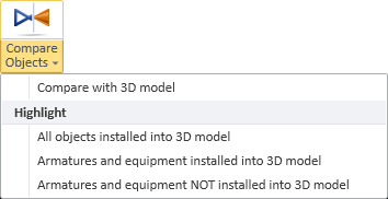 Select Compare Objects to view which objects in the diagram have been inserted to the 3D model via integration. See Integration between P&ID and 3D model.