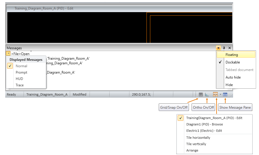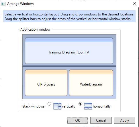 When you have several diagrams open, use the menu of the Windows status bar button to switch between the diagrams or to arrange the diagram windows.