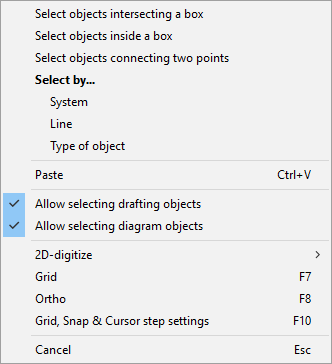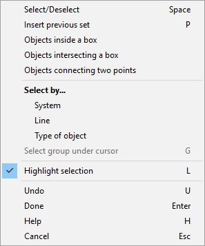 When using a command that requires objects to be selected, the context menu contains the following commands.