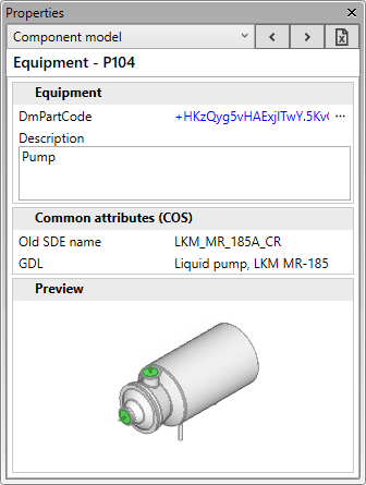 Clicking the "DmPartCode" value displays the component model in an object browser dialog.