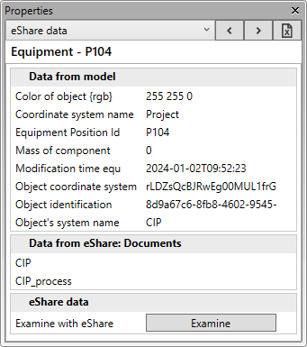 If the position ID of the selected object is found in eShare, this command shows the eShare data of the object in a separate dialog. |