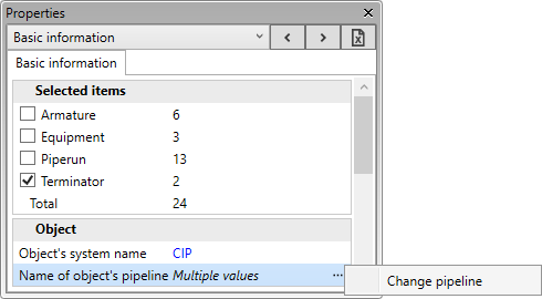 You can change the System, pipeline, electric circuit, or instrument tag of an object by selecting … and then Change system, Change pipeline, Change circuit, or Change loop, as appropriate.