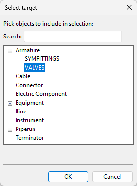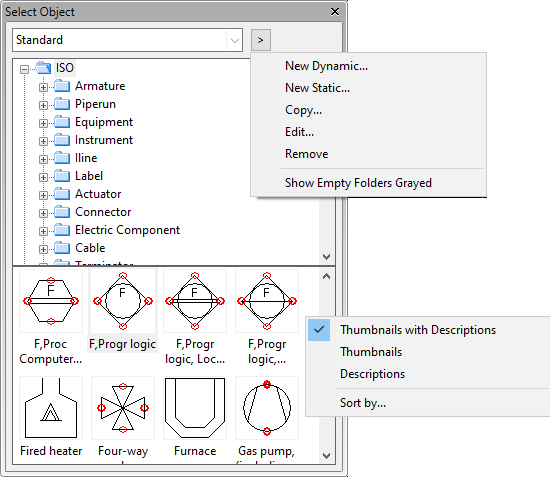 The Select Object pane, which you can show or hide from Template Pane, shows all the available object templates that define diagram symbols and connection lines. You can use this pane to insert object templates into P&I diagrams.