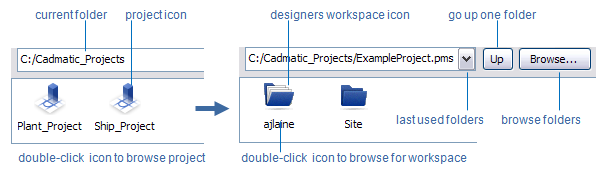 The CADMATIC desktop shows the path to the currently selected folder. You can navigate in the directory structure as follows: