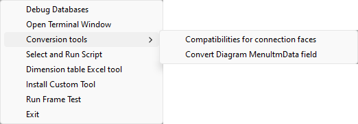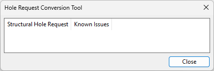 Opens the Hole Request Conversion Tool dialog where you can manually convert old RFH (Request For Hole) objects to new Hole Request objects. Normally, upgrading to 2019T3 or newer converts the RFH objects automatically, but they might remain unconverted if automatic conversion has failed or the objects are checked out to an area that has not been opened in this version. The tool shows the remaining RFH objects, lists the issues found in them, and allows converting them to the new format.