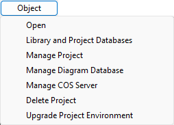 When a project is selected, or when in a workspace folder and the Parent-> icon is selected, the Object menu contains the following items.