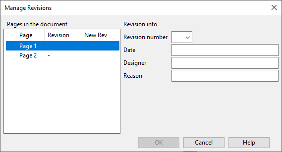 Typically, the initial release is published without a revision ID. When opening an already released document for editing, the program suggests a new revision to be created, and the designer is prompted to provide information about the new revision, using the fields defined by the administrator as described in Document revising and publishing. For example: