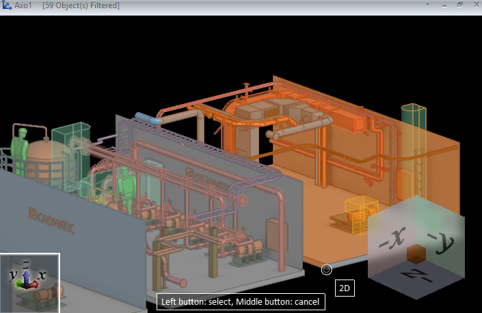 This tool has a number of hotspot areas, and if the active work view is shaded, moving the mouse cursor to a hotspot highlights the part of the model area that would be inside the filter box. Observe the color highlighting as well as the axis indicator letters of the cube and the work view to make sure that you are setting the filter box in the expected location.