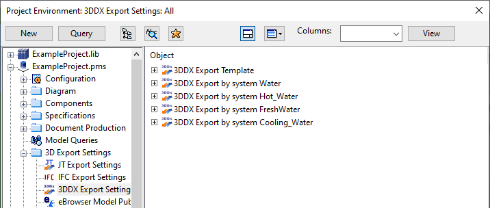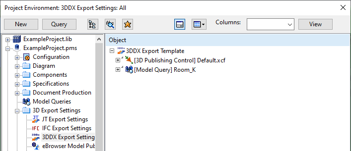 In the Project Environment dialog, [project] > Model Queries now contains the generated System-specific queries, and [project] > 3D Export Settings > 3DDX Export Settings contains the System-specific export settings that you can select to use in a 3DDX export.