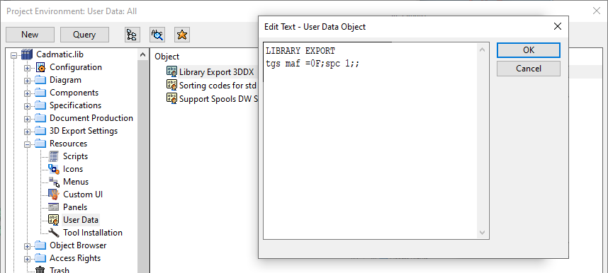 Library export for 3DDX requires the administrator to create a COS configuration object of type "User Data" which defines the scope of the export. This configuration is a text file that lists one or more Plant Modeller tags, and a library part is exported if it has any of those tags (attributes), even if the tag does not have a value in the given part.