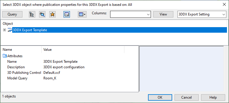In the settings dialog, which is described in 3DDX export settings, select a Model Query that selects the 3D objects and a Publishing Control that selects the metadata (object attributes) that you want to export, and set the other settings as appropriate.