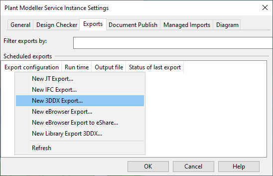 Right-click the Scheduled exports pane and select New 3DDX Export from the context menu.