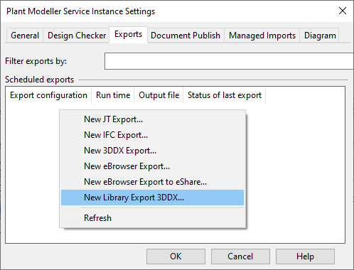 Right-click the Scheduled exports pane and select New Library Export 3DDX from the context menu.