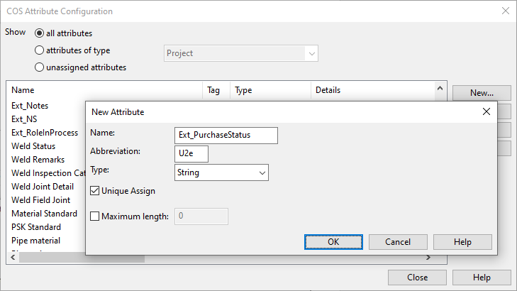 Project administrator should create a separate COS attribute for any piece of data that is used via integration. As an example, the administrator can define that "Ext_PurchaseStatus" is a COS data holder for a status value coming from a PDM system via the CADMATIC Web API. In the picture below, the abbreviation (tag) in COS will be "U2e" and the type of the attribute is String. As the Unique Assign option is enabled, if this attribute is assigned for example to the "External Data Management" (EDM) object type, it can no longer be assigned to any other object type.
