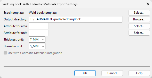 The Welding Book With Cadmatic Materials Export Settings dialog opens. Define the export settings.