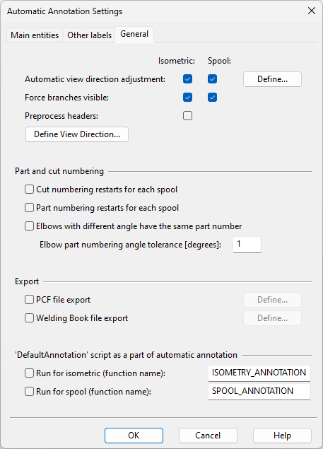 Automatic view direction adjustment – Select this option and click Define if you want to specify an adjustment angle for the annotation of isometrics or spools.